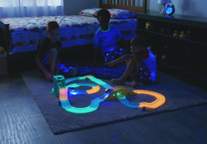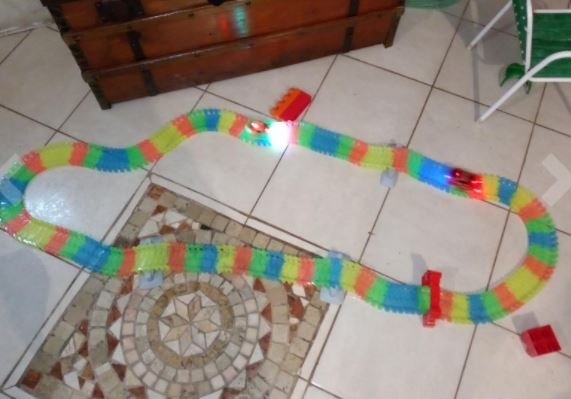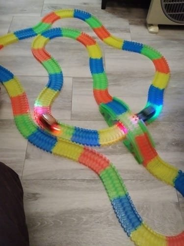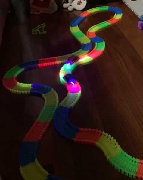 “Finalmente una pista facilissima da montare a portata di un bambino di 3 anni. Una volta fatto buio in casa, si illumina. Le 2 macchinine nella confezione, alimentate a pile, sono luminosissime e si rincorrono senza mai uscire dalla pista. Inoltre, si possono montare dei ponticelli e le automobiline faranno acrobazie!”