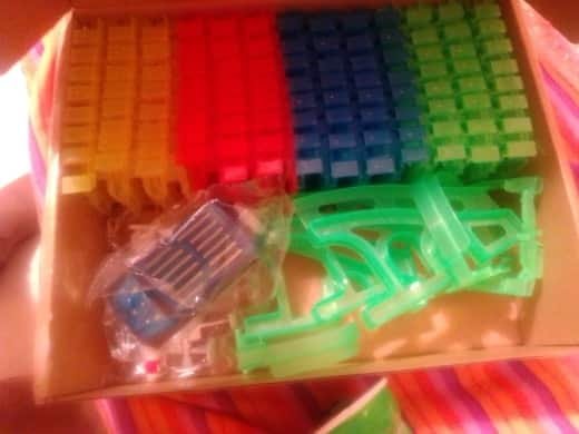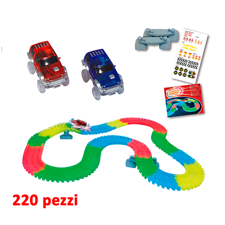 All’interno della confezione è presente: 220 binari flessibili e pieghevoli da montare insieme per la pista, 2 macchine con luce led, 2 controller e un manuale d’istruzioni.