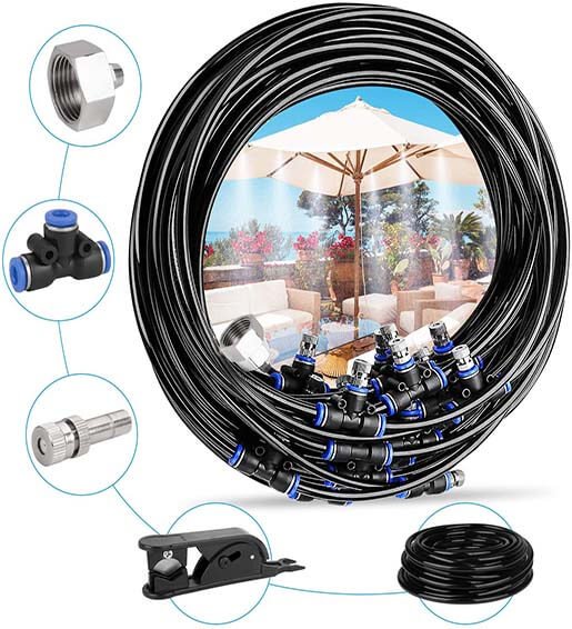 Questo fantastico nebulizzatore per esterno sfrutta una serie di ugelli dai quali esce l’acqua sotto forma di vapore acqueo. Tra i suoi punti di forza spiccano: le tubature flessibili resistenti ai raggi UV; la lunghezza che raggiunge 10 metri; l’alta precisione e l’ampio raggio dei 10 ugelli e il comfort climatico che riesce a creare, infatti è in grado di portare la temperatura fino a circa 20°. Infine è molto facile da montare, basteranno pochi minuti per preparare il tutto.