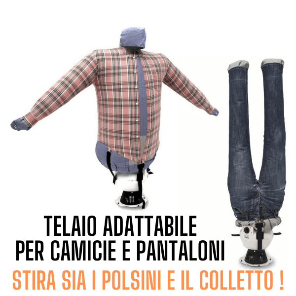 Composto da una base dove sono presenti tutti i comandi e da un supporto rigido che soffia aria calda dentro al telaio manichino gonfiabile adattabile a qualsiasi indumento, inoltre è dotato di un timer e di una temperatura regolabili in base ai vari tessuti. Basteranno pochi minuti per asciugare il capo e eliminare tutte le pieghe, l’indumento risulterà asciutto e stirato.
